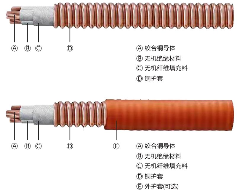 產(chǎn)品描述:導(dǎo)體由由多股銅線絞合而成,具有良好的彎曲特性。采用耐高溫、不燃燒的無機(jī)絕緣材料,合成云母帶耐溫能達(dá)到1050℃,金屬護(hù)套使用高導(dǎo)電率的紫銅材料,經(jīng)軋絞特殊加工有良好的彎曲特性,并可作為PE線使用,外護(hù)層采用低煙無鹵阻燃的聚烯烴材質(zhì),具備良好的防腐蝕特性,部分場合也可不用外護(hù)層。